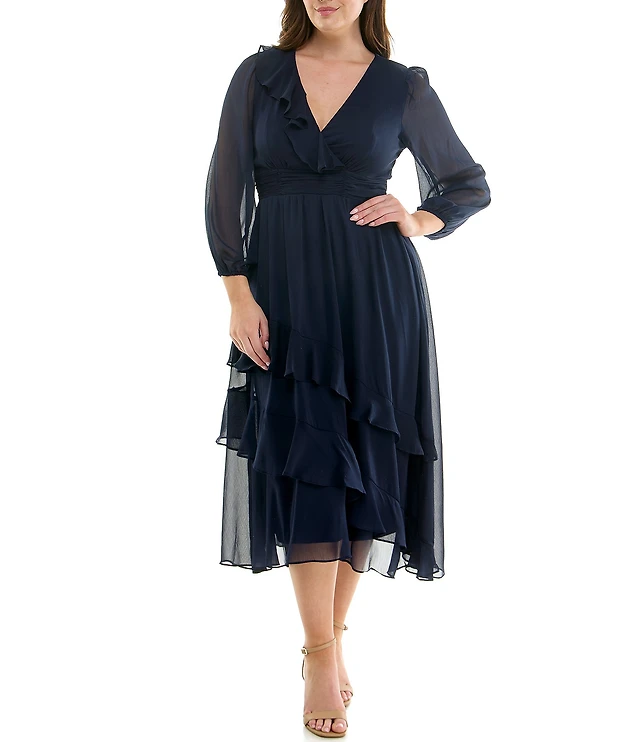 Le' AL.X Chiffon Ruched Mock Neck Long Blouson Sleeve Tiered Ruffle Shift Maxi Dress