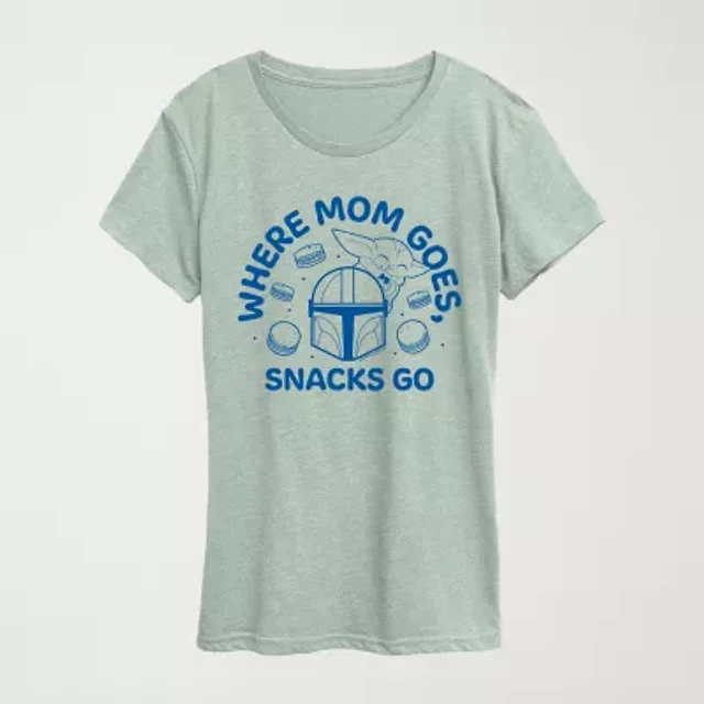 Where Mom Goes Snacks Womens Crew Neck Short Sleeve Classic Fit Baby Yoda Graphic T-Shirt