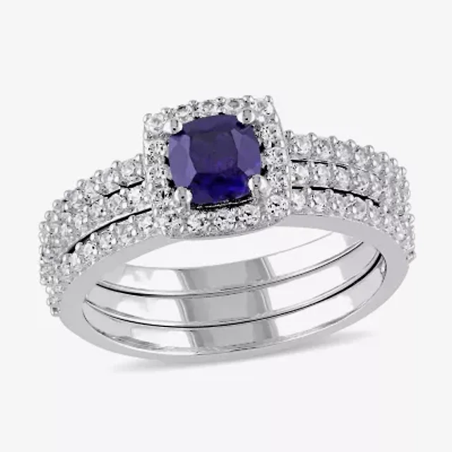 Modern Bride Gemstone Womens Lab Created Blue Sapphire Sterling Silver Cushion Halo Bridal Set