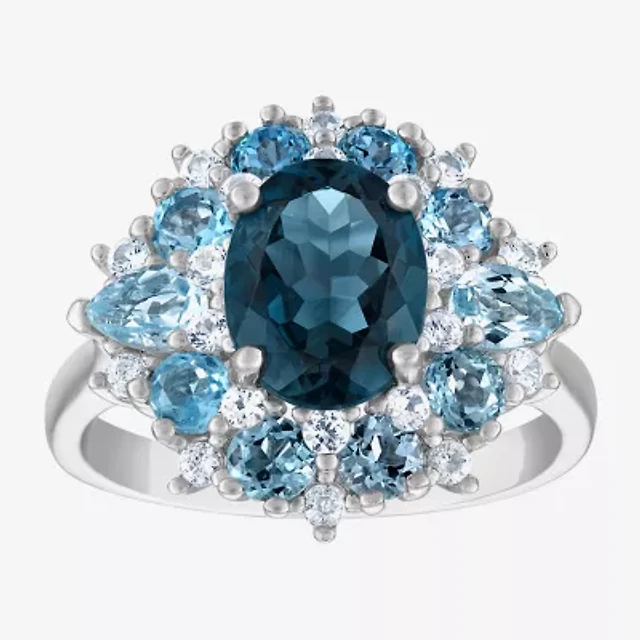 Suzy Levian Sterling Silver Oval Cut Topaz and Sapphire Double Halo Ring