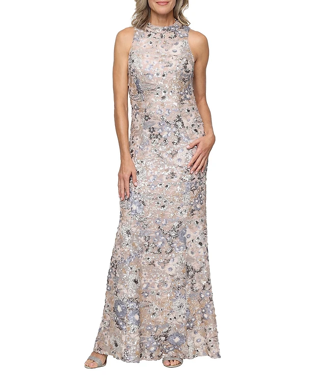 Mac Duggal Sleeveless Floral Beaded Striped Sequin Sheath Midi Dress