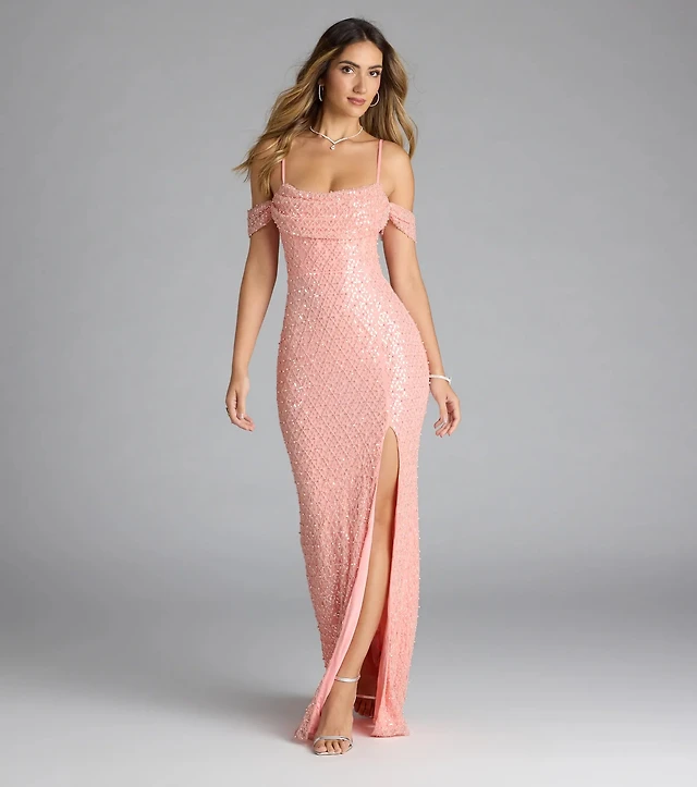 Gracie Formal Off The Shoulder Iridescent Sequin Dress