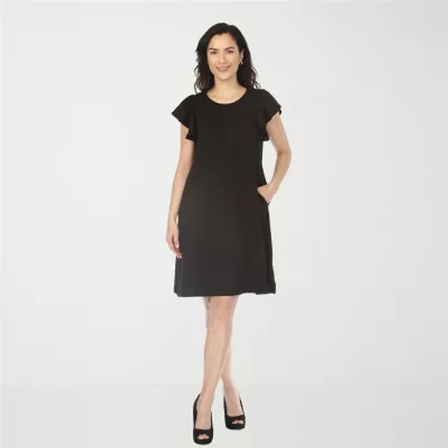 Ignite Evenings Petite Size Shimmer Tiered Ruffle V-Neck Embellishment Short Flutter Sleeve Shift Dress