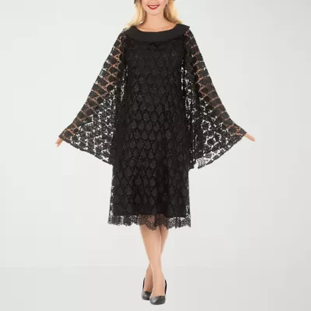 Ignite Evenings Chiffon Metallic Print V-Neck Short Sleeve Tiered Caplet Dress