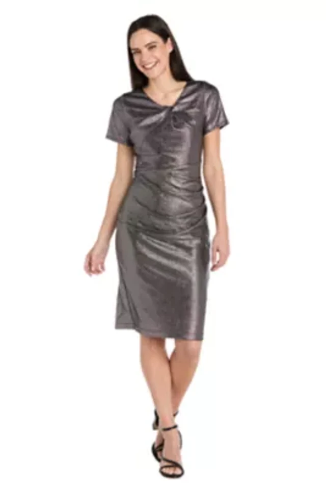 Maggy London Scuba Crepe Boat Neck Short Sleeve Asymmetrical Hem Midi Dress