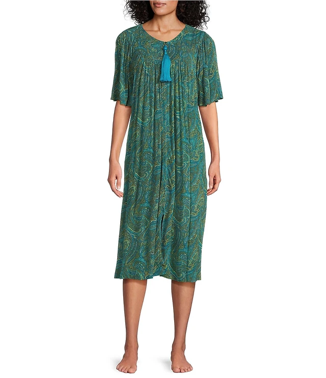 Go Softly Paisley Short Sleeve V-Neck Zip-Front Crinkle Patio Dress
