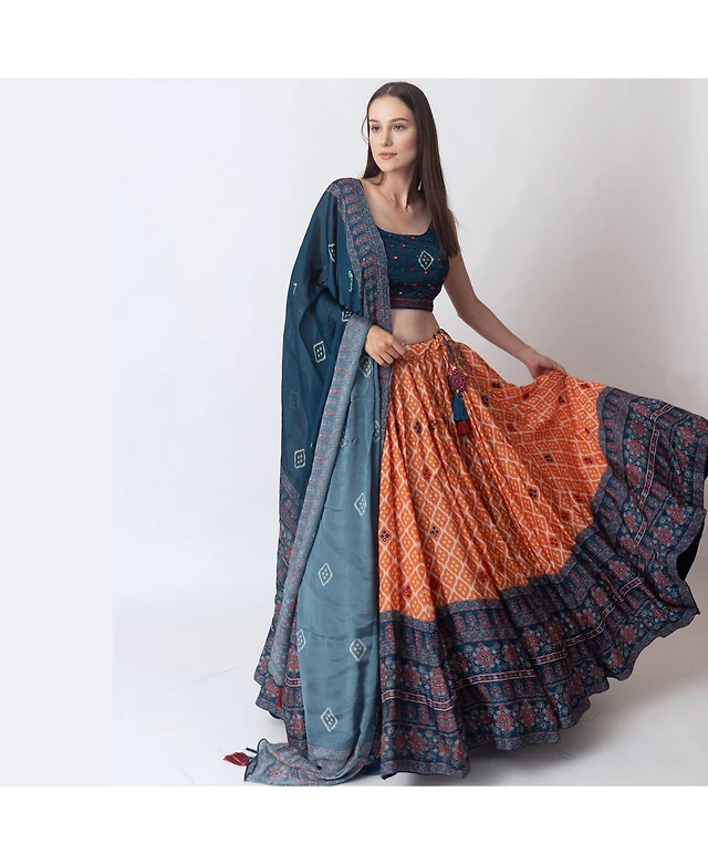 Raas Women's Bandhani and Ajrakh Print Chaniya Choli with Mirror Work