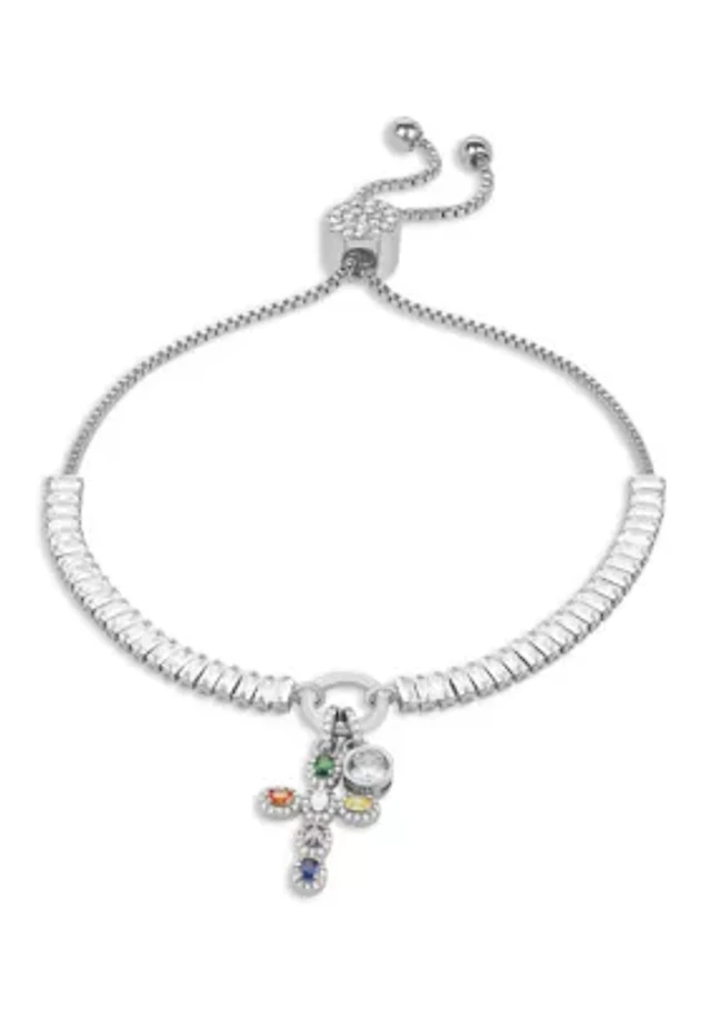 Silver Plated Baguette CZ Multi Color Cross Charm Adjustable Bracelet