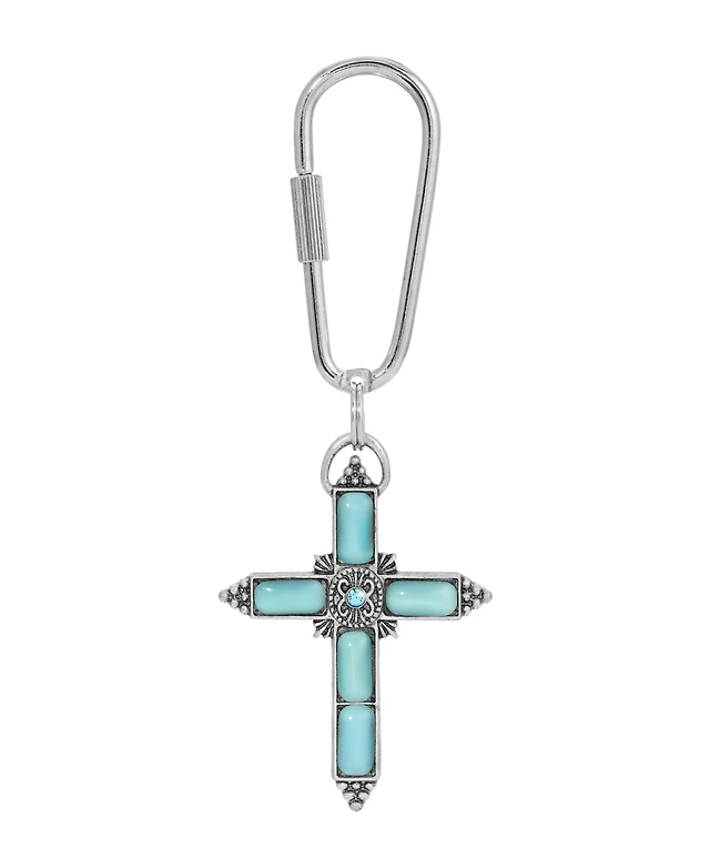 Silver-Tone Aqua Moonstone Aqua Crystal Cross Key Chain