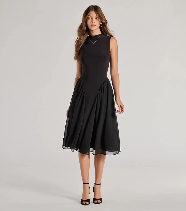 Chic Girl Flocked Mesh Mock Neck Midi Dress