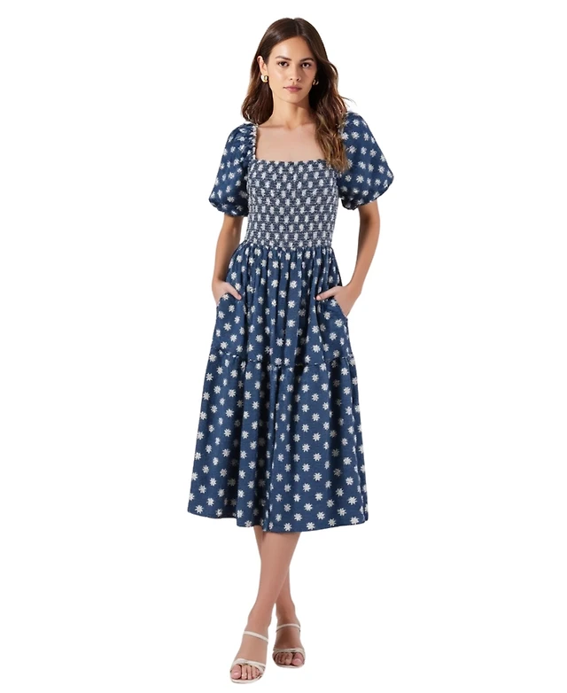 Stacey Puff Sleeve Smocked Rose Midi Dress