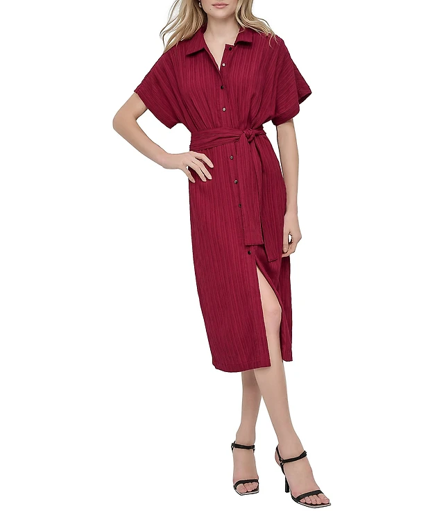 Donna Karan Button Front 3/4 Sleeve Belted Midi Shirt Dress