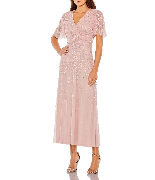 Mac Duggal Beaded V-Neck Flutter Sleeve Faux Wrap Midi Dress