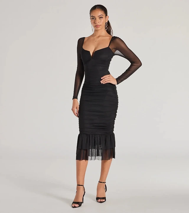 Elegant Ruched And Ruffled Mesh Midi Dress
