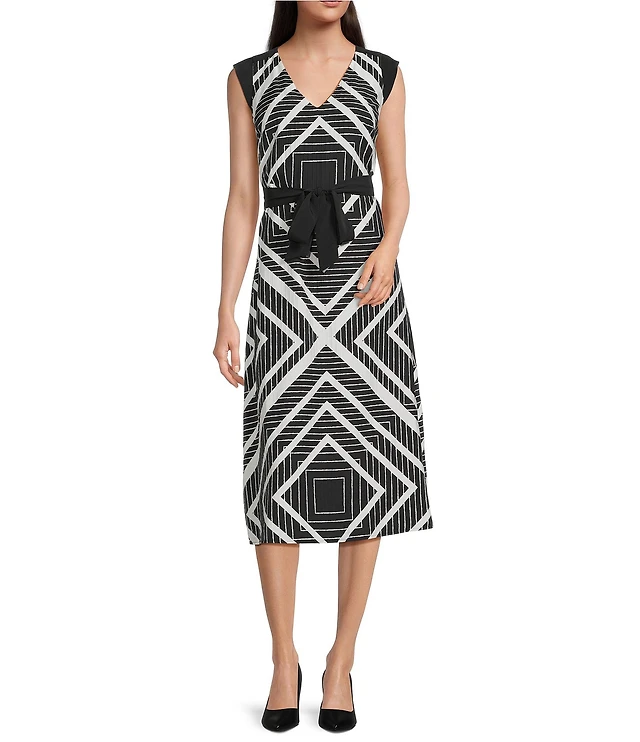 Tahari Asl Women's Printed V-Neck Tie-Waist Midi Dress
