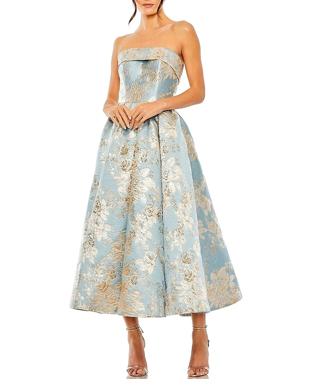 Mac Duggal Floral Brocade Strapless Sleeveless Gathered Skirt Side Pocket Midi A-Line Dress