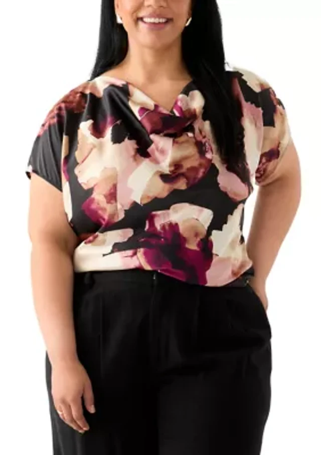 Anne Klein Drape Neck Short Sleeve Abstract Printed Satin Blouse
