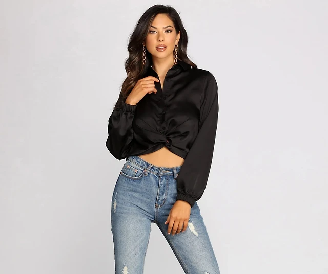 Effortlessly Fab Satin Long Sleeve Cropped Blouse