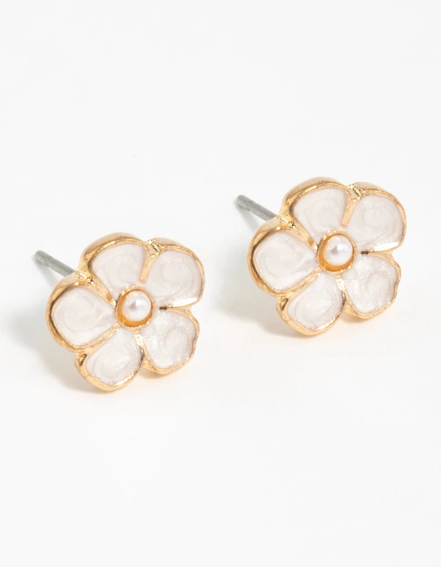 Gold White Pearlised Flower Drop Earrings