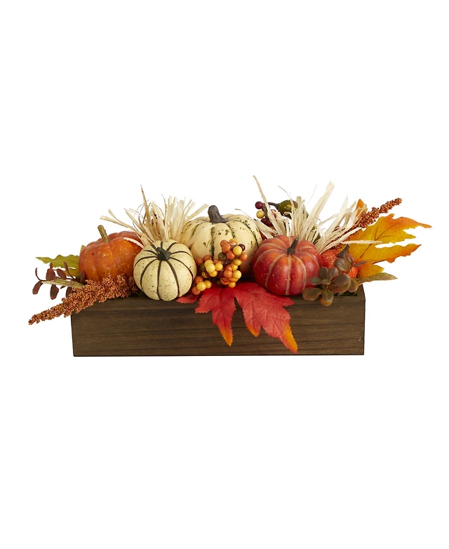 Nearly Natural Harvest Pumpkin and Berries Artificial Arrangement in Wood Vase