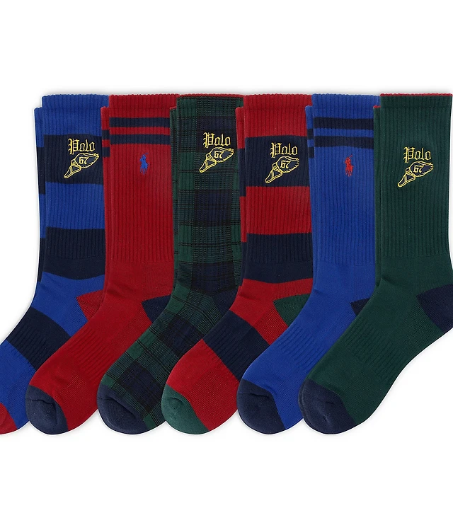 Polo Ralph Lauren Big & Tall Plaid and Stripe Varsity Wing Logo Crew Socks 6-Pack