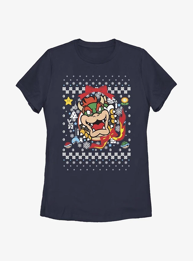 Nintendo Super Mario Wreath Bowser Christmas Pattern Womens T-Shirt