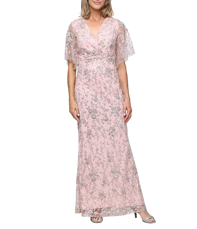 Ignite Evenings Petite Size Sequin V-Neck Short Flutter Sleeve Sheath Gown