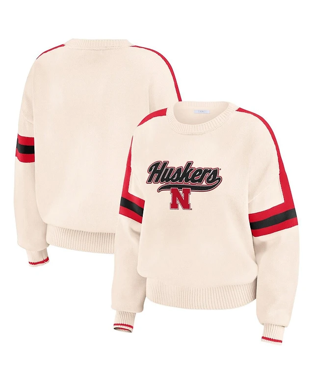 Wear by Erin Andrews Women's Cream Nebraska Huskers Chenille Woven Patch Stripe Pullover Sweatshirt