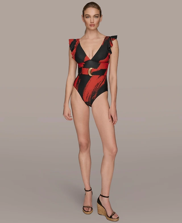 Gibson & Latimer Diamond Textured Solid V-Neck Belted Tortoise Ring One Piece Swimsuit