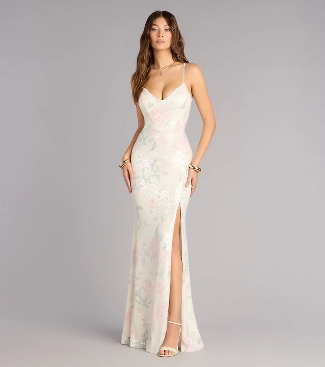 Aleah Floral Sequin Beaded Mesh Mermaid Dress