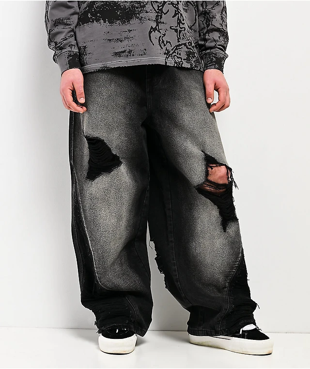 Vitriol Void Depth Distressed Black Wash Wide Leg Jeans
