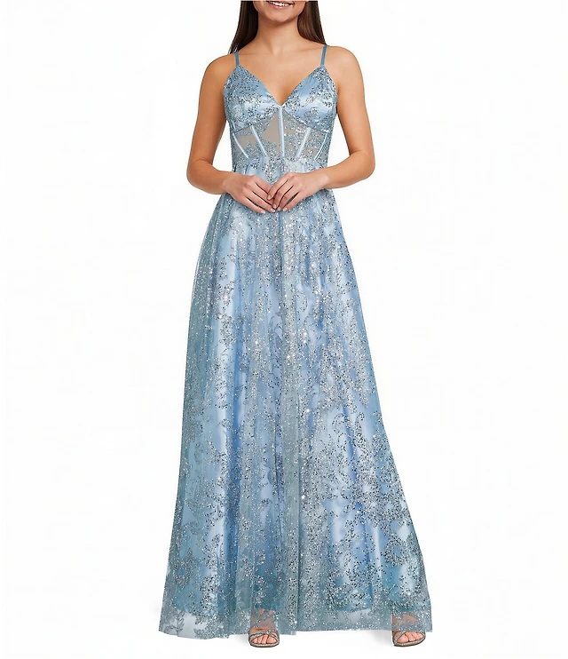 Blondie Nites Glitter Patterned Sweetheart Neck Illusion Corseted Lace Up Tie Back Long Dress