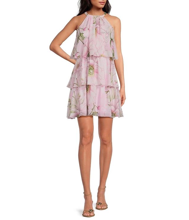 Jessica Howard Tiered Floral Chiffon Flutter Sleeve Dress