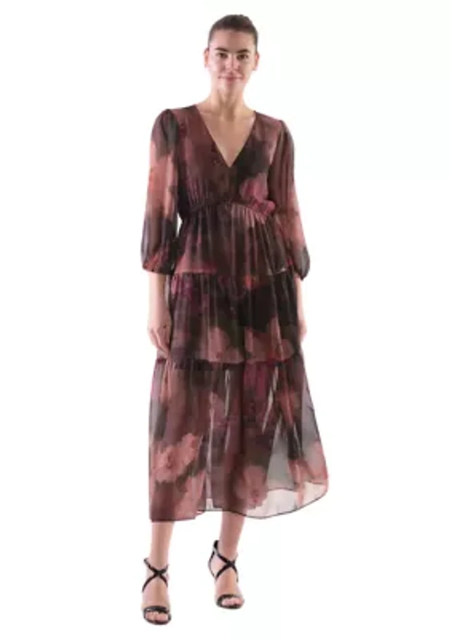 DKNY by Donna Karan Chiffon Floral Tiered V-Neck Short Flutter Sleeve Maxi Dress