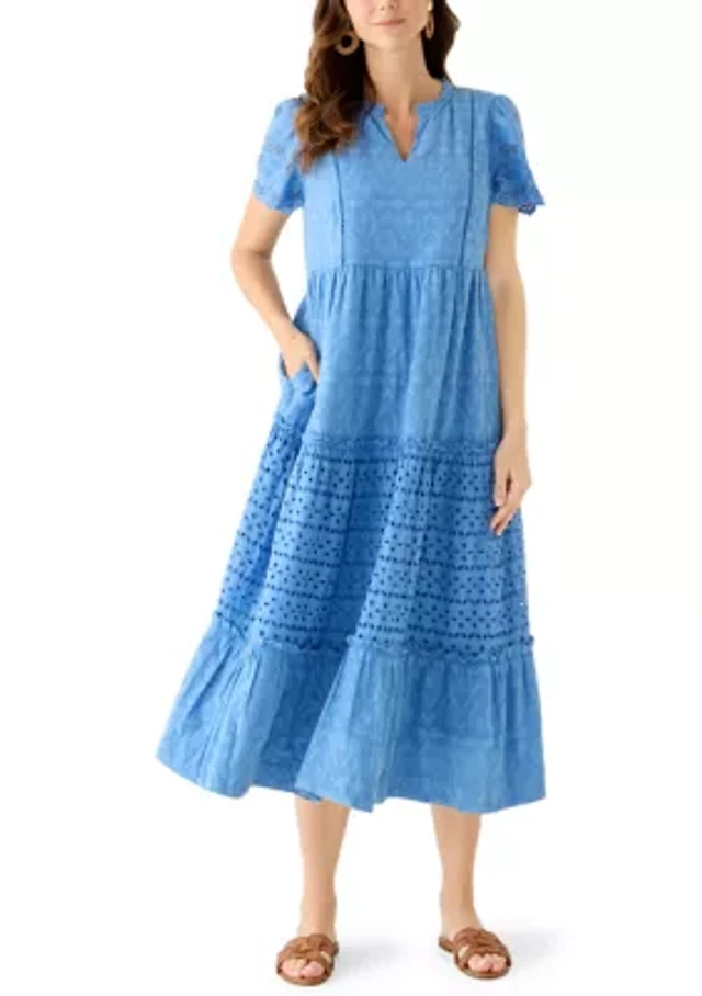 Ignite Evenings Plus Size Chiffon Boat Neck 3/4 Sleeve Beaded Trim Tiered Midi Dress