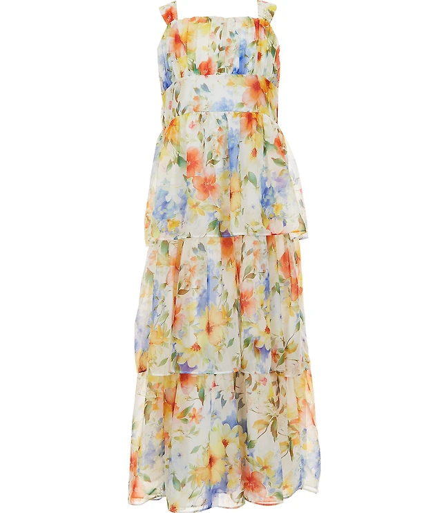 Allison & Kelly Big Girls Flutter Sleeve Floral Printed Checkered Chiffon Tiered Maxi Dress
