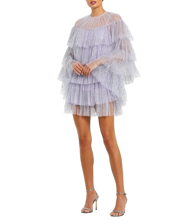 Mac Duggal Women's High Neck Mesh Tier Embroidered Dress