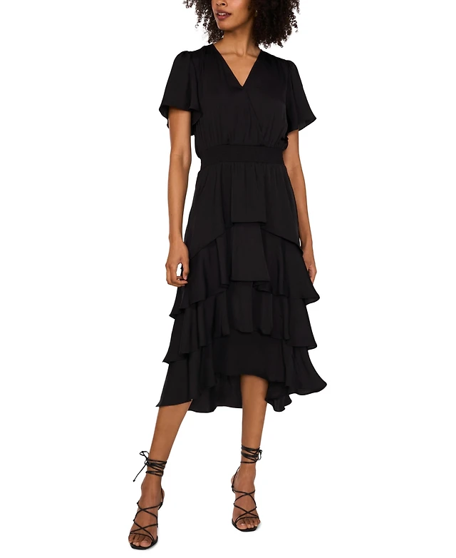 Ignite Evenings Petite Size Shimmer Tiered Ruffle V-Neck Embellishment Short Flutter Sleeve Shift Dress