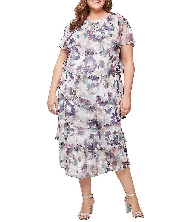 R & M Richards Plus Size Stripe Wet Print Satin Chiffon Short Bell Sleeve Tiered Hem Sheath Dress