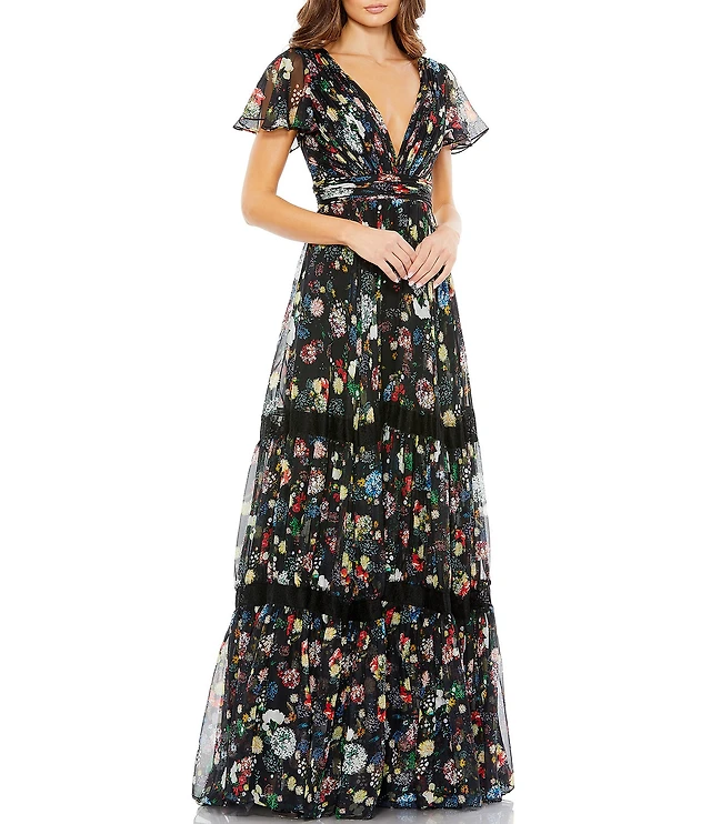 Blondie Nites Floral Printed Sweetheart Drape Neck Corseted Bustier Bodice Ruffle Tiered Lace Up Back Long Dress