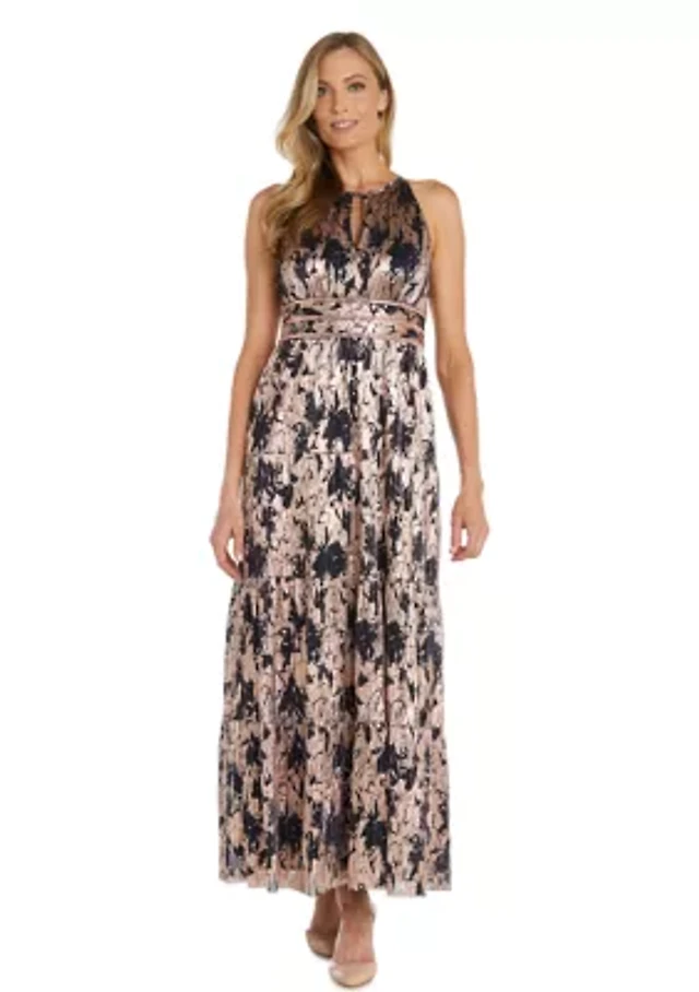 R & M Richards Plus Size Crinkled Lurex Mesh V-Neck Sleeveless Tiered Gown