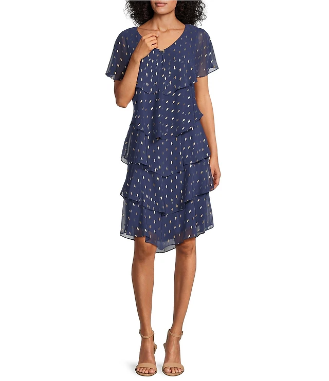 Ignite Evenings Chiffon Metallic Print V-Neck Short Sleeve Tiered Caplet Dress