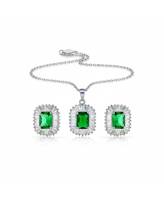 Bling Jewelry Art Deco Jewelry Green Cz Pendant Necklace & Baguette Cubic Zirconia Halo Stud Earrings Jewelry Set