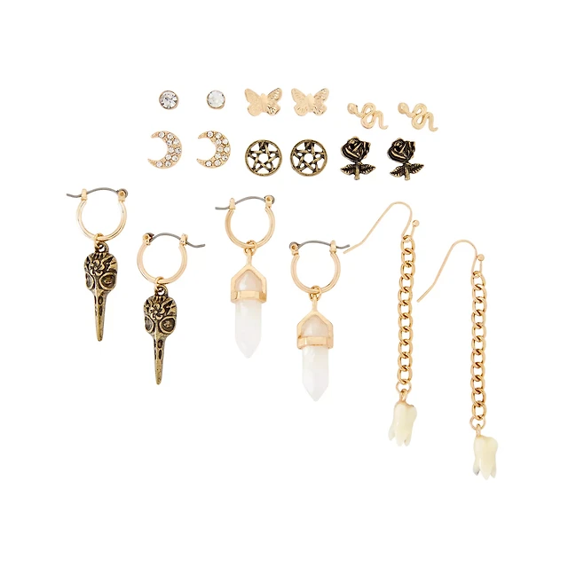 Multi-Pack Goldtone Crystal Tooth Snake Earrings - 9 Pair