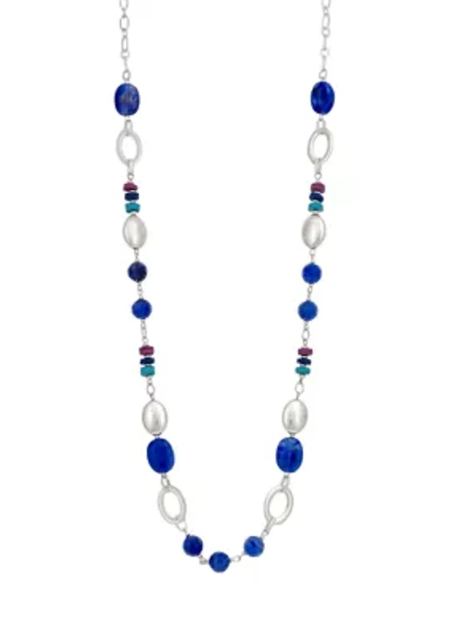 Silver Tone Blue Multi Single Row Long Linked Bead Necklace
