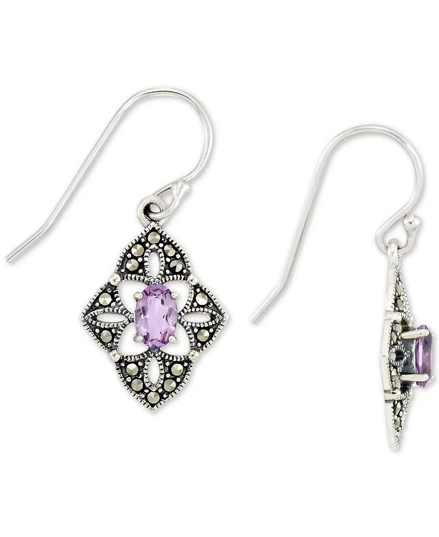 Jade (15 x 20 x 4mm) & Marcasite Flower Drop Earrings in Sterling Silver