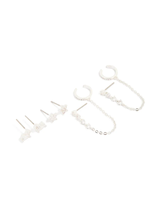 Silver Plated Cubic Zirconia Dainty Motif Stud Earrings 6-Pack