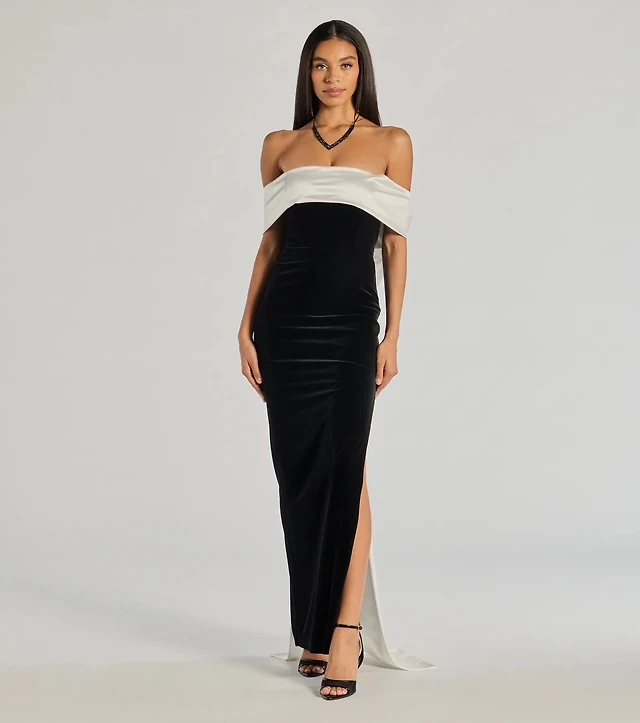 Xscape Off the Shoulder Velvet Ruffle Gown