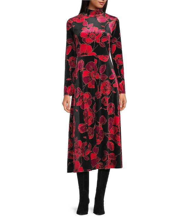 Mac Duggal Illusion Round Neck Long Sleeve Velvet Trim Floral Fit & Flare Midi Dress