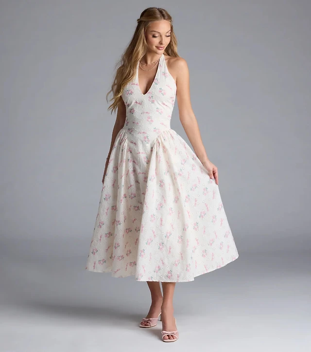Sunny Daze Charm Halter V-Neck Floral A-Line Midi Dress